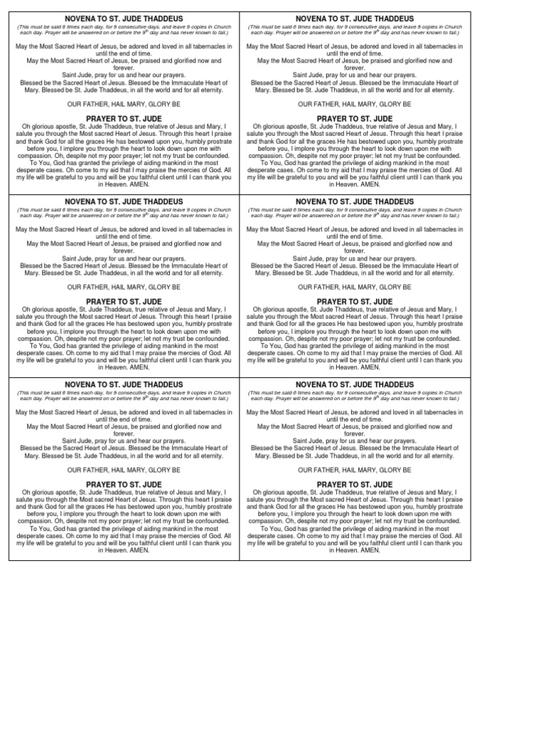 For the ENTIRE Novena you mustprint a total of 81 copies 9 consecutive days of the novena and leaving 9 copies in Church each day 81 Fold the single sheet of paper twice to create a four-fold booklet with the Novena to Saint Jude. The Saint Jude Novena Prayers Day 1 St. Jude Begin by reciting the prayer.
